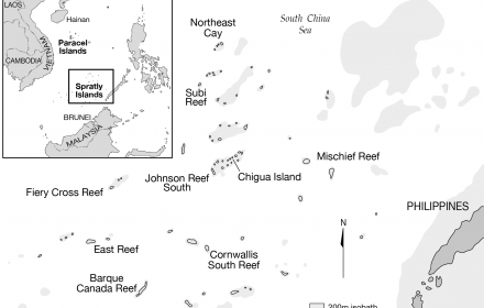Map 2. Simplified map of Spratly Islands showing China's developing naval and air bases at Fiery Cross Reef, Subi Reef and Mischief Reef.